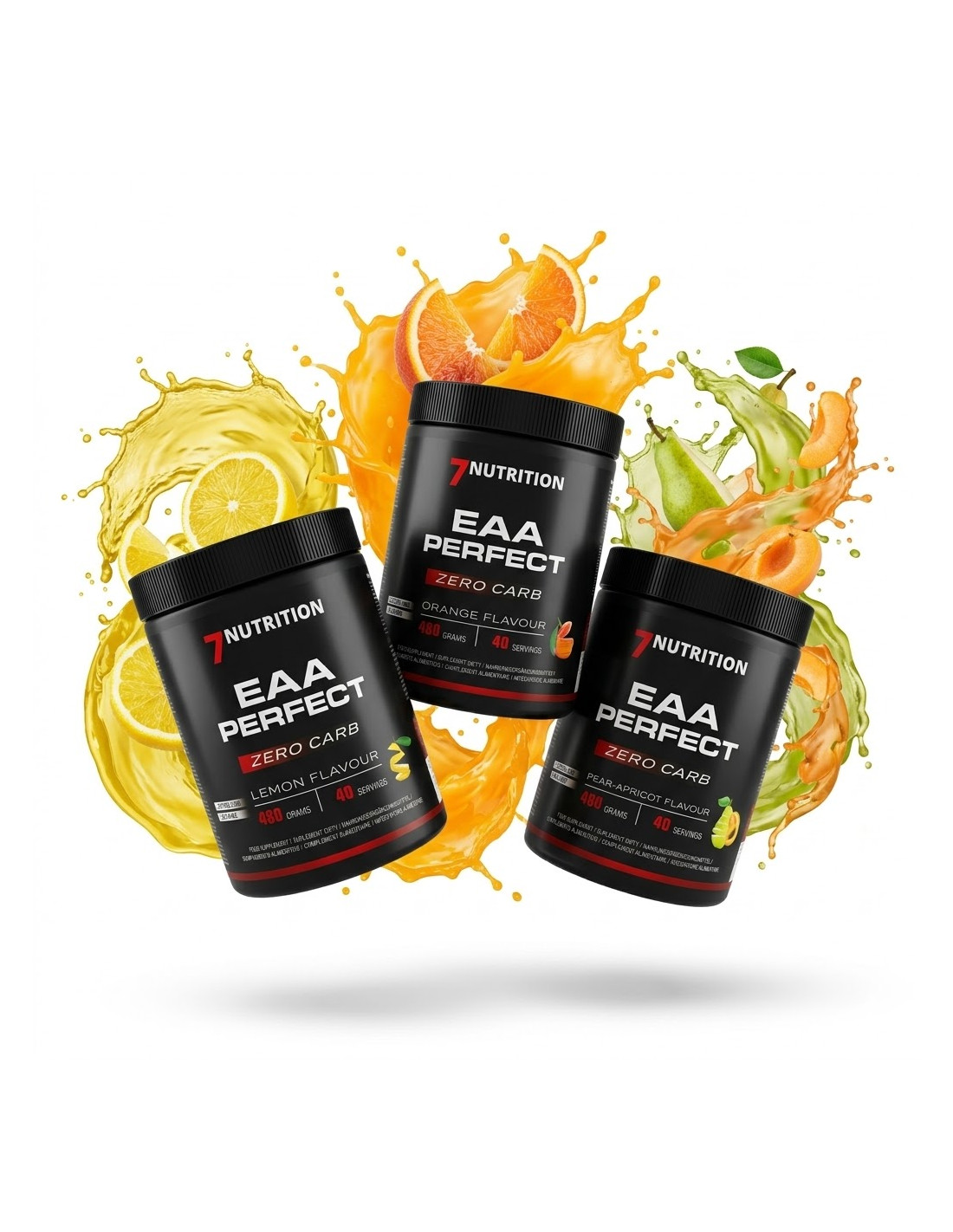 EAA Perfect 480 g de 7Nutrition es un complemento alimenticio en polvo que aporta un perfil completo de aminoácidos esenciales (EAA), junto con betaína anhidra y malato de L-citrulina.