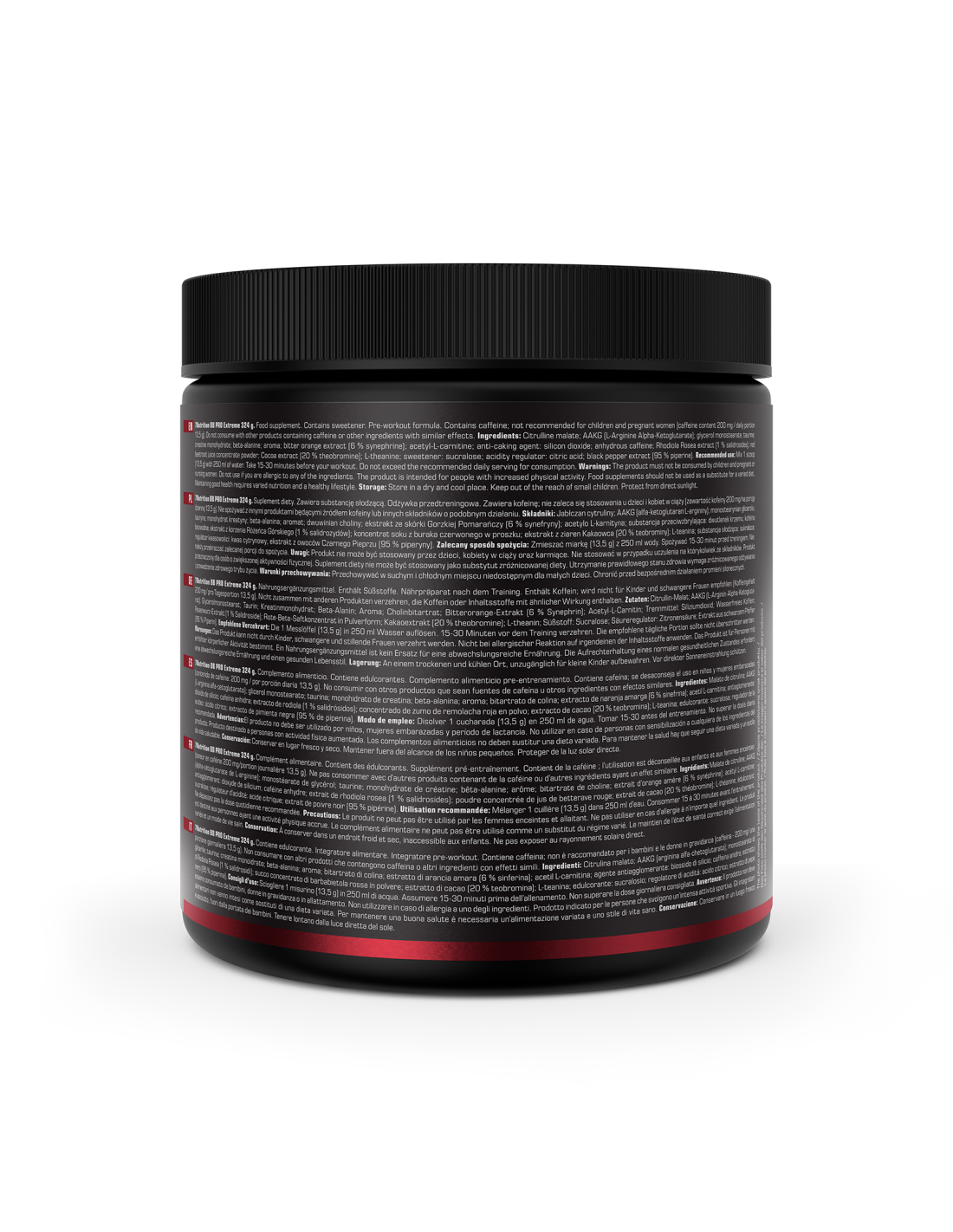 Malato de citrulina; AAKG (L-arginina alfa-cetoglutarato); monoestearato de glicerol; taurina; monohidrato de creatina; beta-alanina; aroma; extracto de naranja amarga (6 % sinefrina); acetil-L-carnitina; antiaglomerante: dióxido de silicio; cafeína anhidra; extracto de Rhodiola rosea (1 % salidrósidos); concentrado de zumo de remolacha roja en polvo; extracto de cacao (20 % teobromina); L-teanina; edulcorante: sucralosa; regulador de acidez: ácido cítrico; extracto de pimienta negra (95 % piperina).