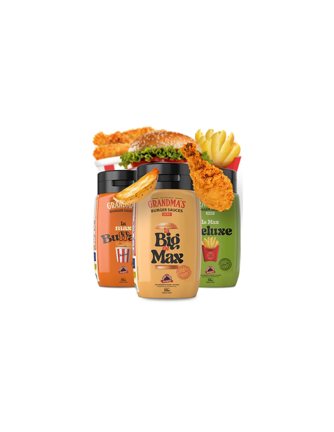 Las nuevas Grandma’s Burger Sauces de BIG by Max Protein® llegan para dar sabor a tus burgers, alitas y patatas sin remordimientos. Con menos de 18 kcal por ración, disponibles en 3 sabores irresistibles: Big de Max, Max Buffalo y Max Deluxe.