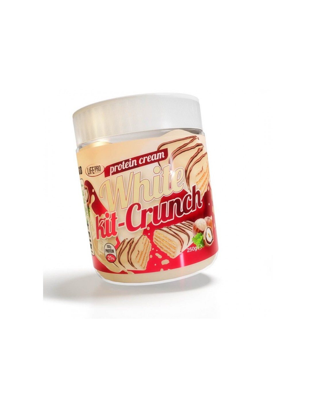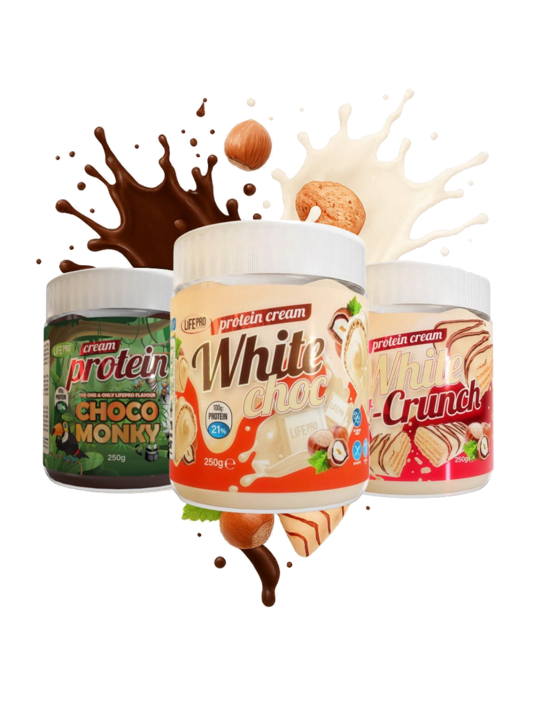 Deliciosa crema proteica de untar de Life Pro Fit Food, disponible en sabores únicos como White Chocolate, Kit-Crunch Cookie y Choco Monky. Con hasta un 22% de proteína, sin azúcares añadidos, sin conservantes artificiales y perfecta para deportistas y amantes de un estilo de vida saludable.