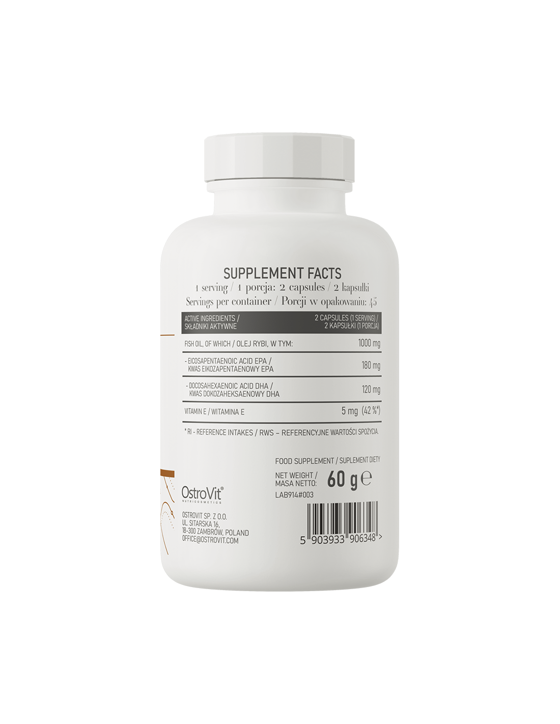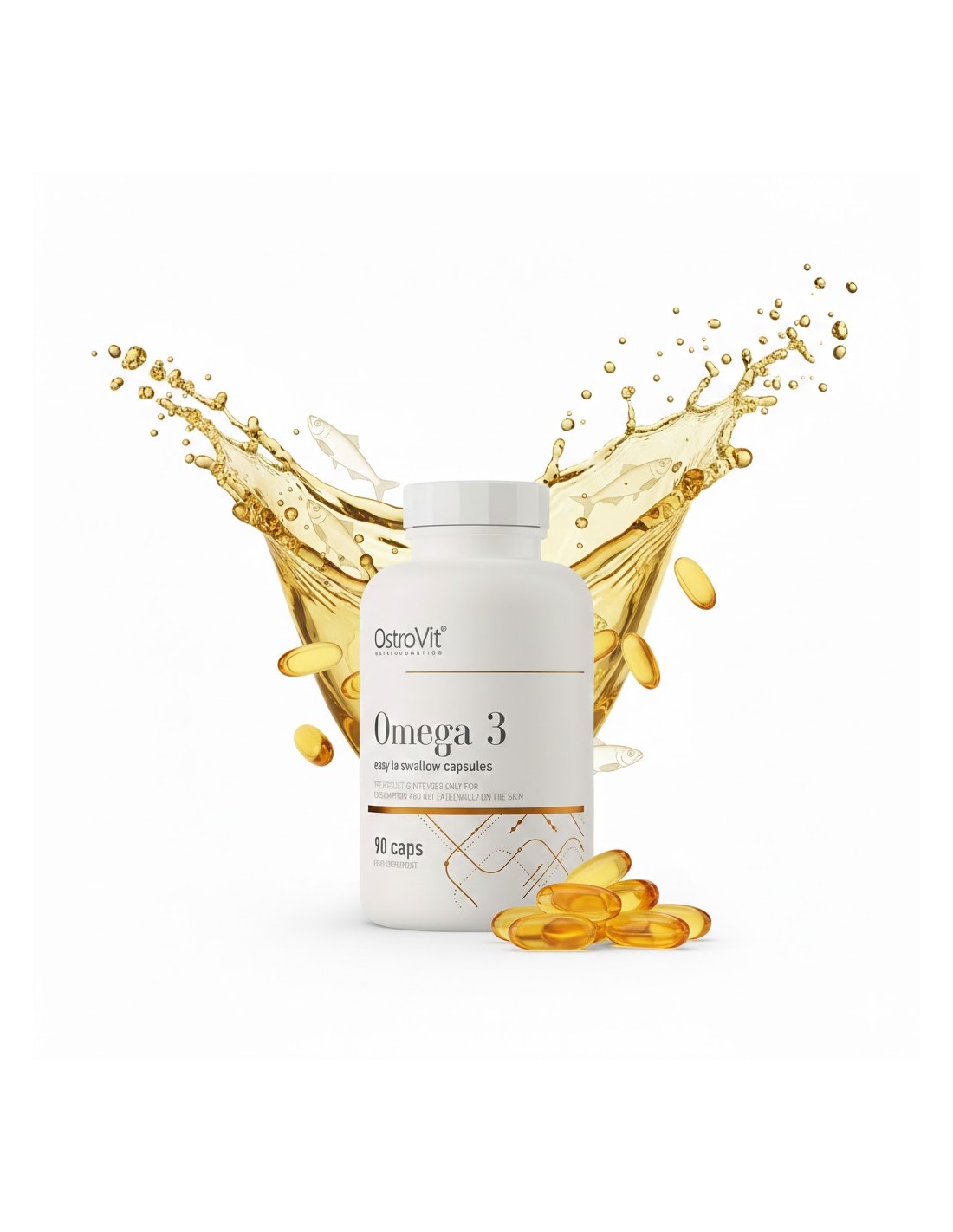 OstroVit Omega 3 Easy 90 cápsulas es un complemento alimenticio a base de aceite de pescado, fuente natural de ácidos grasos omega 3 EPA y DHA, enriquecido con vitamina E. Su formulación está pensada para complementar la dieta diaria de personas activas y deportistas que buscan un aporte sencillo y eficaz de omega 3.
