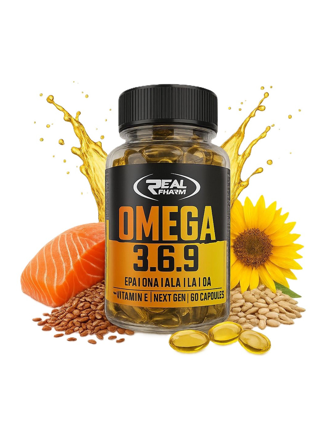 Omega 3-6-9 de Real Pharm es un complemento alimenticio que combina aceites de pescado, girasol y linaza, enriquecido con vitamina E. Aporta ácidos grasos esenciales EPA, DHA, ALA y ácido linoleico para apoyar la salud cardiovascular, el equilibrio nutricional y el bienestar general.